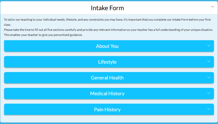 The Intake Form is a crucial part of your Gokhale Online Consultation, along with your photos. It provides your Gokhale Method Teacher with important insights into your lifestyle, health, and pain history. Completing the form before your scheduled appointment is highly recommended to ensure your session is both productive and comprehensive.